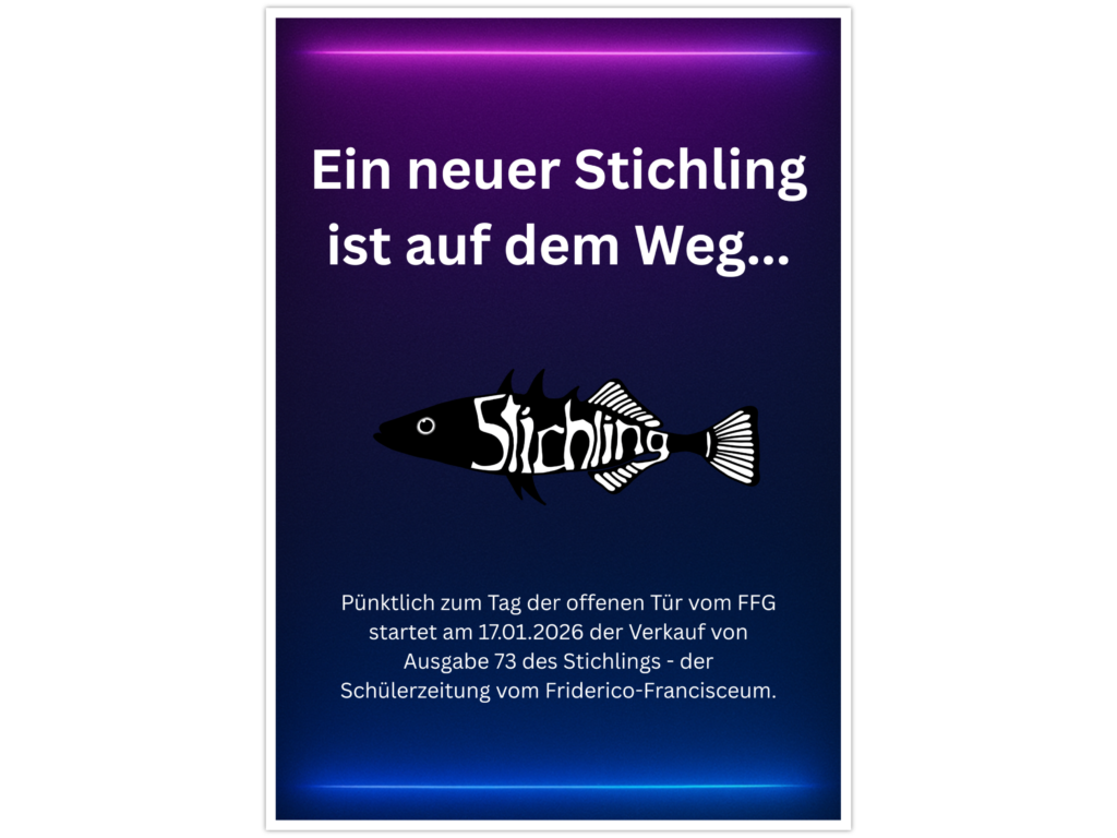 Die 73. Ausgabe unserer Schülerzeitung startet bald in den Verkauf. Am 17.01.2026 – pünktlich zum „Tag der offenen Tür“ ist es soweit. Der erste Stichling in 2026 geht in den Verkauf. Ab heute gibt es eine Woche lang jeden Tag um 9 Uhr eine Info dazu auf unserem Instagram-Kanal und auf unserer Website.